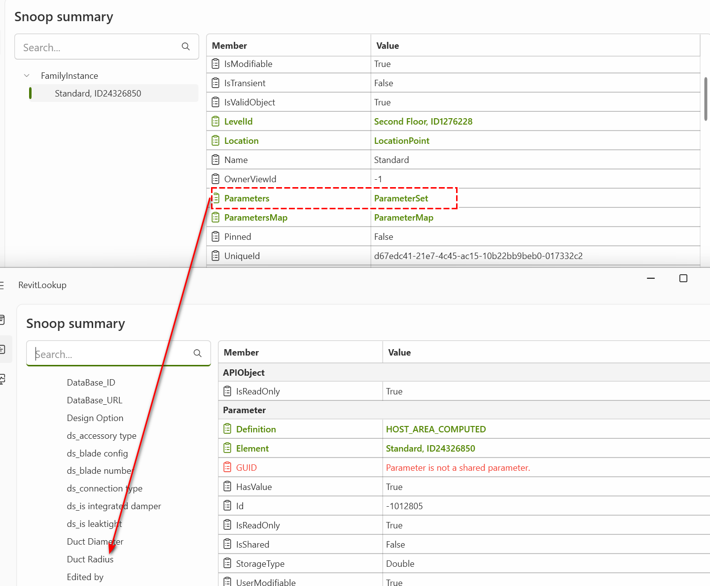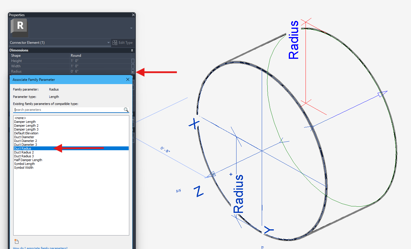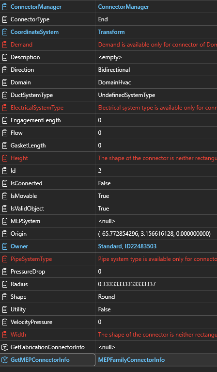 I am needing help with retrieving duct connector associated parameters.