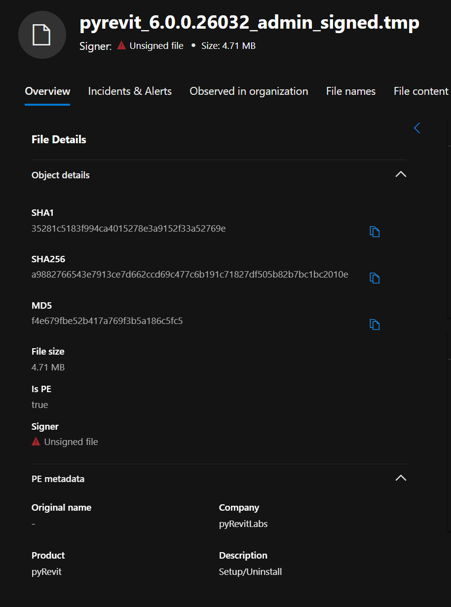 Here is a screenshot of the detected file being unsigned for further clarity and confirmation: