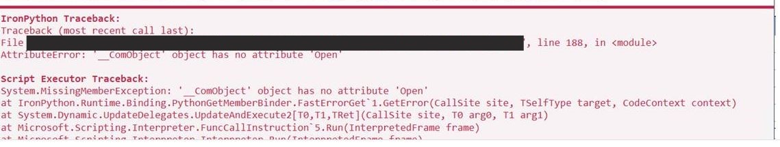 We recently migrated to Revit 2025, all good with the latest pyrevit versions but we have an incompatibility with a custom toolbar. When we press the pushbutton it instantly throws’ the below error message. I have tried to edit the script to update it to a newer excel version to fix the Com object error but it looks like I am running in circles as one error leads to another. Did anyone had anything similar? The toolbars runs on python scripts only, nothing extra.