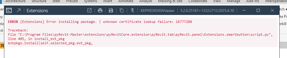 We are receiving the following error when trying to install any of the PyRevit extensions. We have tried uninstalling and reinstalling the latest version.