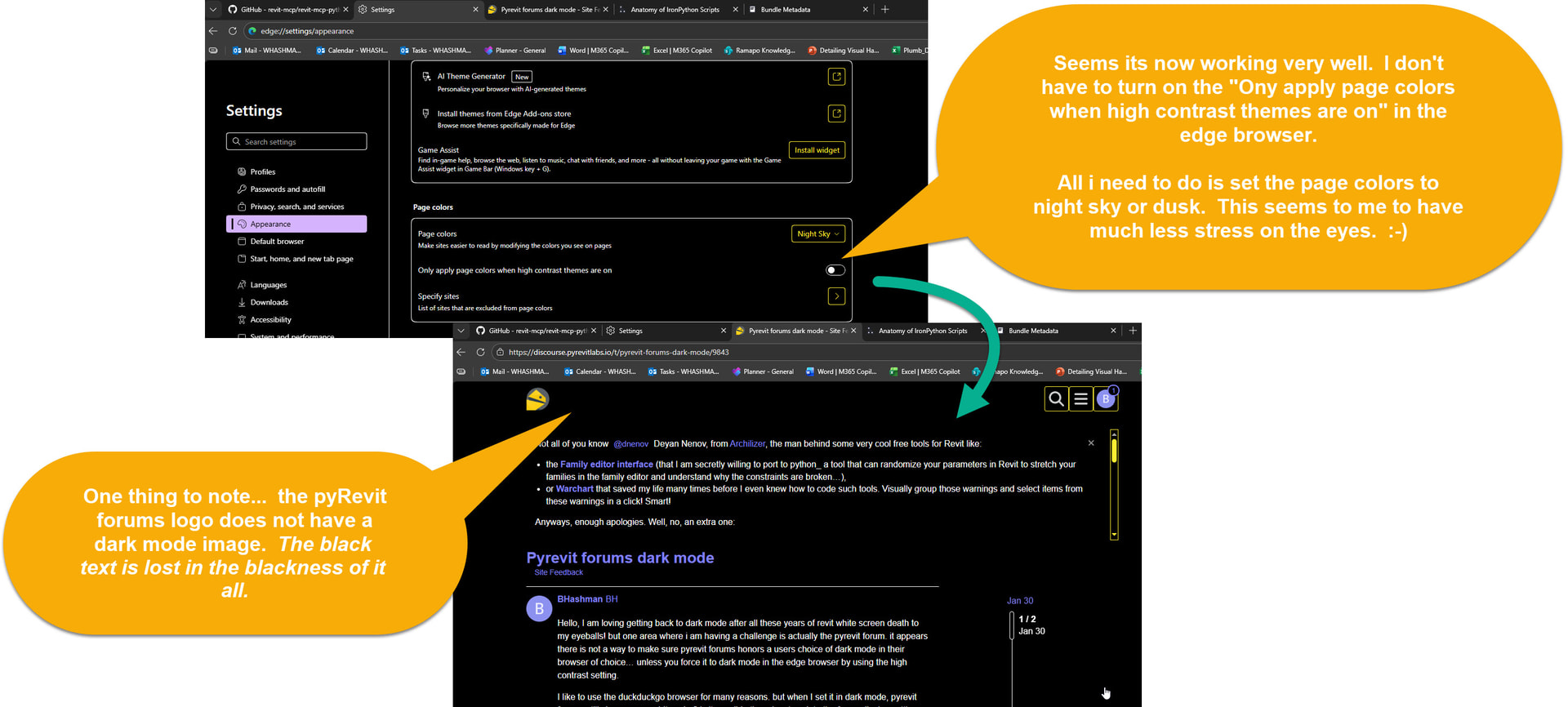 Hello, I am loving getting back to dark mode after all these years of revit white screen death to my eyeballs! but one area where i am having a challenge is actually the pyrevit forum. it appears there is not a way to make sure pyrevit forums honors a users choice of dark mode in their browser of choice… unless you force it to dark mode in the edge browser by using the high contrast setting.
