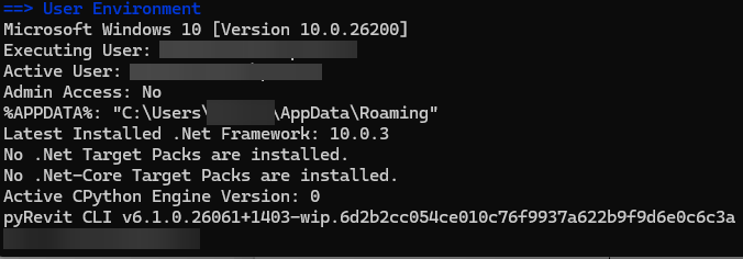 If I open a command prompt and run “pyrevit env”, it shows “User Environment” information at the bottom. I noticed that it provides a different Windows version than “System/About” does. Is this a known issue? Or maybe it is reading something else? I assumed that they are supposed to match but maybe I’m missing something.