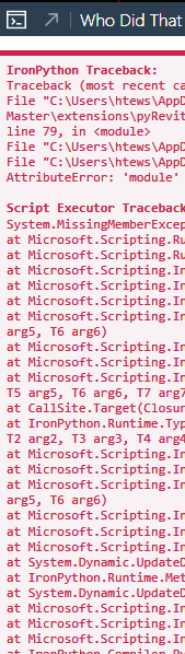 File "C:\Users\htews\AppData\Roaming\pyRevit-Master\extensions\pyRevitTools.extension\pyRevit.tab\Project.panel\ptools2.stack\Team.pulldown\Who Did That.pushbutton\script.py", line 79, in <module>